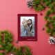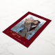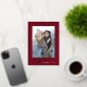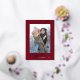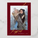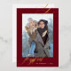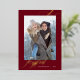 This elegant photo Christmas card offers a vertical photo on the front and a smaller square photo on the back. The modern swirly script text "Joyful" appears in real gold foil on a dark red background. The backside offers custom text for you to add a personal message.