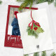 This design features a Christmas happy holidays greenery photo, with a one 1 single picture template, red and green holly berries, a winter greenery foliage botanical leaves, with pine tree branches branch berry, a watercolor red ribbon bow mistletoe, a lovely Christmas holiday photo cards, with a simple minimalist family photo, an elegant classic traditional Christmas, a stylish trendy calligraphy script