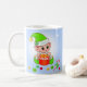 Modern cute green Christmas elf with gift box, Christmas balls, candy cane and star on light blue background Christmas Mug. Name can be personalised.