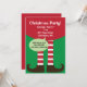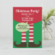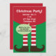 This cute Christmas party invitation features a the bottom half of one of Santa's elves wearing red and white stockings and black shoes.