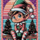 A cheerful elf dressed in a festive outfit sits atop a stack of colourful gifts, surrounded by glowing Christmas trees. The background features a vibrant sunset with a patterned design, enhancing the holiday theme.