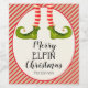 Fun elf legs wearing red and ivory striped tights and green boots with jingle bells, and your holiday Christmas greeting in chic lettering, personalise these wine bottle labels to serve at your holiday party or to give as gifts or party favours for business gifts, corporate gifts, CHANGE THE WORDING "Merry Elfin Christmas" to anything! MATCHING items in our store.
