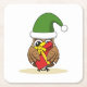 An illustration of a shy happy elf owl with green santa hat and red present with yellow ribbon. This cute cartoon design is a gift idea for owl lovers, bird lovers, and fantasy or magical movie lovers. Are you excited to receive your gift on Christmas?