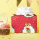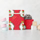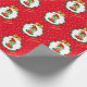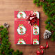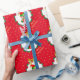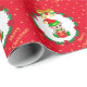 Cute Christmas elf holding a gift box at the centre of a pine wreath ornamented with poinsettias, red balls and golden stars on red background Gift Wrapping Paper.