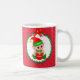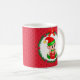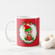 Cute Christmas elf holding a gift box at the centre of a pine wreath ornamented with Christmas red balls and red hearts on red background Mug. Enjoy the most wonderful and magical time of the Year!