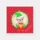 Cute Christmas elf holding a gift box at the centre of a pine wreath ornamented with golden and red balls surrounded by stars on red Christmas Paper Napkin. Text can be personalised. Have a wonderful Christmas!
