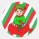 Red, green and white striped festive stickers with an adorable cute hand drawn cartoon elf sitting on Santa's toy bag smiling.