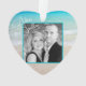 Christmas ornaments for engaged couples. Heart-shaped tree ornament with beach theme and two sea stars to represent the couple. One side has two text templates for “Engaged at Christmas” with year or date. On the other side, upload a photo of the couple and add names. Customise all text as you wish.