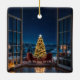 A beautifully decorated Christmas tree stands proudly before open French doors, revealing a breathtaking view of a snow-dusted landscape under a starlit night sky. Two cosy armchairs flank the tree, inviting quiet contemplation and festive cheer. The warm glow of the Christmas lights and a flickering candle create an atmosphere of peace and tranquillity.
