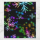 Christmas falling various neon colours snowflakes SlipperyJoe artistic gay pride gifts LGBTQIA dark background vibrant winter vibrant colourful digital illustration blue green pink yellow multicolored bokeh lights festive lively atmosphere depth dimension hanging thin lines black background