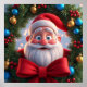 Adorable cartoon Santa Claus smiling amidst a decorated Christmas wreath adorned with ornaments and festive lights. Perfect for holiday themes, Christmas greetings, and cheerful seasonal depictions.