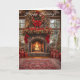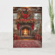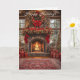Beautiful Christmas card with an image of a stone fireplace decorated with red stockings, greenery, holiday lights and pretty Christmas wreath.