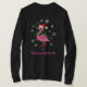 A festively decorated, pink flamingo wearing a Santa hat, string lights, and candy cane striped socks. Snowflakes are falling around her and there's a Flamingo Ho Ho Ho greeting in pink topped with snow. Shown here on a custom women's long sleeved t-shirt. Fun for anyone that loves a tropical style Christmas!