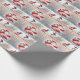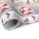 A festive flamingo is ice skating while wearing a red Santa hat, scarf, and skates