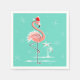 Mid century inspired design featuring a festive pink flamingo wearing a red Santa hat, stars and palm trees decorated with baubles set against an aqua background. A customisable design for you to personalise with your own text, images and ideas. An original digital art image created by Quirky Chic.