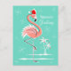 Stylish design with a retro touch featuring a festive pink flamingo wearing a red Santa hat, stars and palm trees decorated with baubles set against an aqua background. A customisable design for you to personalise with your own text, images and ideas. An original digital art image created by Quirky Chic.