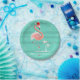 Mid century inspired design featuring a festive pink flamingo wearing a red Santa hat, stars and palm trees decorated with baubles set against a striped aqua background. A customisable design for you to personalise with your own text, images and ideas. An original digital art image created by Quirky Chic.
