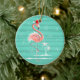 Stylish design with a retro touch featuring a festive pink flamingo wearing a red Santa hat, stars and palm trees decorated with baubles set against a striped aqua background. A customisable design for you to personalise with your own text, images and ideas. An original digital art image created by Quirky Chic.