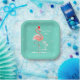 Mid century inspired design featuring a festive pink flamingo wearing a red Santa hat, stars and palm trees decorated with baubles set against an aqua background. A customisable design for you to personalise with your own text, images and ideas. An original digital art image created by Quirky Chic.