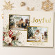 Festive holiday two-photo card design featuring overlapping photos, "Joyful" greeting in custom gold foil typography, and colourful corner bouquet of winter pine, roses and holly with gold sparkles.