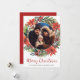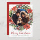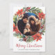 Merry Christmas photo card features an elegant script font with the words 'Merry Christmas' with a festive foliage wreath frame around the photo. Matching red colour on the back of the card with a message in white text. This simple and stylish card is ready for you to customise with your own photo and message. Change the text colour or keep as shown here.