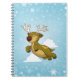 A cute cartoon image of an adorable christmas reindeer flying up in the sky with snowflakes and clouds in the background.