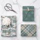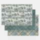 This Christmas woodland wrapping paper set of 3 sheets features coordinating holiday patterns: Cabins in snow-covered forest, plaid, and forest blue with snowflakes.
