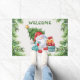 Little cute gnome with Christmas presents and a tree. The frame is made of green fir branches on a white background