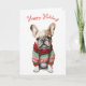 Watercolor French Bulldog in a green and red sweater and snowflakes.