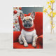 A French Bulldog with a red scarf and t-shirt sits on a plush red chair next to a decorated white Christmas tree with red ornaments