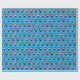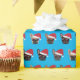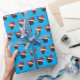 Modern style pattern featuring different colored french bulldogs wearing red Santa hats and sunglasses on a blue background.