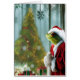 A green frog wearing a red and white Santa suit, standing in front of presents under a Christmas tree in the snowy woods. BLANK INSIDE.