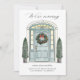 "we're moving" in modern style calligraphy font with digitally watercolored front door with christmas wreath and potted trees, plus a little snow. Backer colour is editable and optional. Original illustrations by Becky Nimoy.