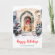 This fun and festive watercolor Christmas card can be personalised with a family name or title. It features a front porch with a wreath and garland. The snow covered trees and flakes of snow create a beautiful winter scene. The text combines handwritten script and modern serif fonts for an elegant and sophisticated look.