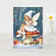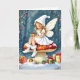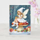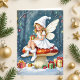 A pretty little fairy in a cute white winter dress, winter hat and furry boots sitting atop a whimsical mushroom covered in Christmas lights and surrounded by gifts. Inside is a sweet holiday poem with a cottage core Christmas vibe.