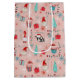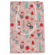 Gift bag with whimsical holiday design featuring Santa cupcakes, snowmen, gift boxes, string lights, and snowflakes on a soft pink background.