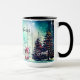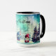 Fantasy illustration of gnomes in winter background with christmas trees.