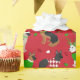 Cute Christmas dogs in festive holiday outfits. German shepherds with white, black, black and tan, black and red, black and silver coats wear Santa hats, antlers, sweaters on a red background with scattered ornaments.