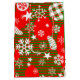Wrap your holiday gifts with festive flair using this Christmas Gift Bag, featuring a vibrant red and green striped background, white snowflakes, ornaments, and the joyful phrase Joy to the World.