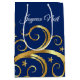 This large size gift bag is shown in a fanciful bold golden coloured swirls and stars with Merry Christmas text on the front. Shown in Sapphire Blue and gold-tone. Text at top of Joyeux Noel.