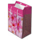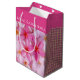 Christmas holiday gift bag shown in pink plumeria and pink plaid print design.