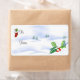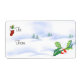 A traditional gift tag sticker for Christmas showing a snow scene and a sprig of holly complete with red berries that are topped with a little snow. A Christmas gift stocking adds the finishing touch.