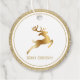 Gift tag is created over a white background with faux glitter accents, matte gold coloured borders and text of Merry Christmas greeting your gift recipient with a centred gold-coloured image of a dashing reindeer.