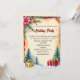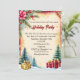 Evergreen trees and gifts wrapped in red and gold paper, with flower and evergreen sprigs at the top makes this Christmas party invitation colourful and festive.