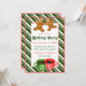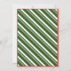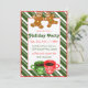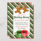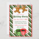 Holiday invitation featuring a giant gingerbread men cookies and mugs of coffee or hot cocoa on a green candy cane striped background.