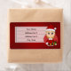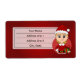 Design with an illustration of a cute smiling happy girl with short blonde hair, she is wearing red and white Santa Claus costume and holding a present; with editable text template for your name or message, Christmas holidays design with a red backround,