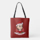Tote bag with an illustration of a cute smiling happy girl with long brown hair, she is wearing red and white Santa Claus costume and holding a present; with editable text template for your name or message, Christmas holidays design with a red background