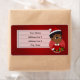 Label with an illustration of a cute smiling African American girl with an Afro hairstyle, the girl is wearing a Santa Clause costume with a red hat and holding a present; in a red circle on a red background, with an editable text template for your name or message