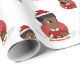 Wrapping paper with an illustration of a cute smiling African American girl with an Afro hairstyle, the girl is wearing a Santa Clause costume with a red hat and holding a present; in a red circle on a white background, with an editable text template for your name or message