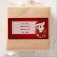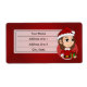 A label Greeting card with an illustration of a cute smiling girl with long brown wavy hair, the girl is wearing a Santa Clause costume with a red hat and holding a present.
